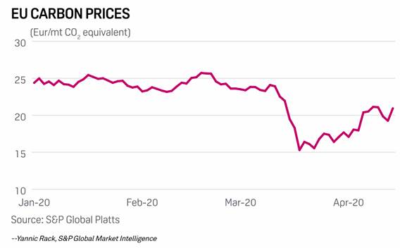 The plunge in EUA prices in March was partly driven by lower economic activity and power demand, but analysts say so-called non-compliance investors, who trade in the market without an obligation, also sold off allowances in droves, amplifying the effect. EU Allowance prices traded in a range of roughly EUR 22 – EUR 26 between January 1 and March 15 but fell sharply to below EUR 15 in late March as most European governments curbed movement of people. EUA futures contracts for December delivery, traditionally the most liquid contract, fell as low as EUR 14.34 per tonne in March, down 45% from a February high of EUR 25.86 per tonne. An illustration is show as below in Figure 2: